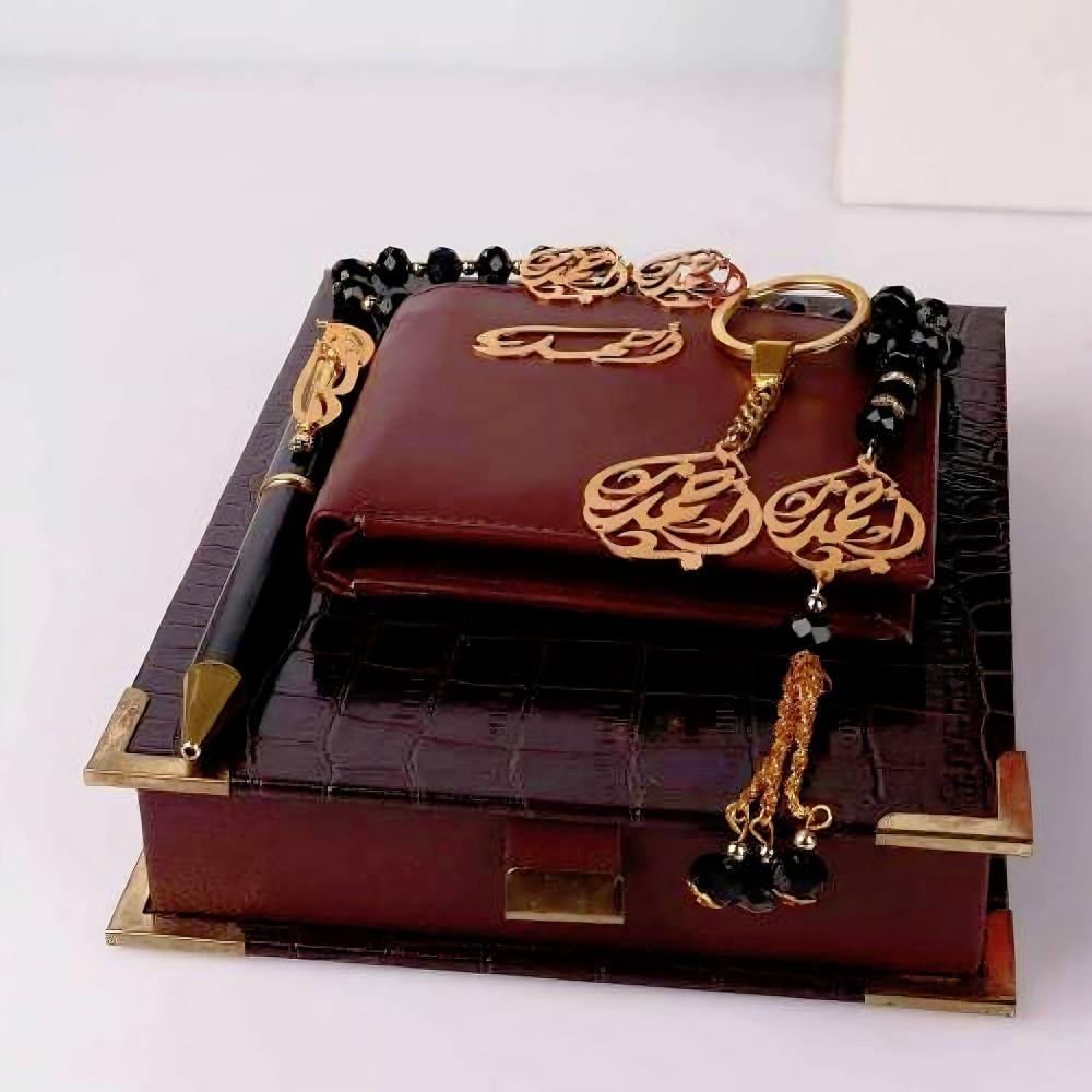 قلم راقي ، سبحة جميلة ، ميدالية مُذهلة ، زوجين من الكبك ، و بوك أنيق ، كلها مُزينة بِاسم الحبيب